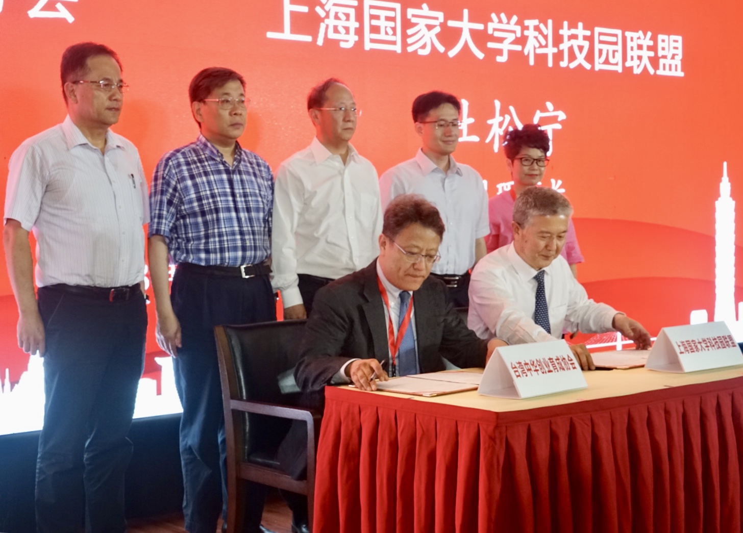 上海国家大学科技园联盟理事长杜松宁与台湾中华创业育成协会理事长黄经尧代表两个行业组织签署了合作备忘录,双方将致力于促进海峡两岸科技成果转化和创新创业优势资源的交流互通,共同扶持两岸青年科技创新创业
