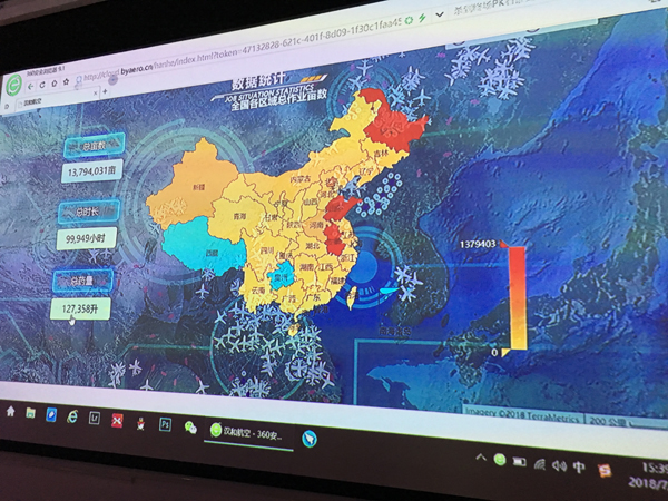 在汉和云平台中,工作人员可以通过电脑随时掌握所有已经注册的农用机飞行状况、飞行轨迹、设置禁飞区,并可对飞机做实时检修。记者在公司展示屏上看到,在中国地图上,公司每一架正在飞行中的农用机都可以看到飞行状态、操作人员和飞行轨迹信息。