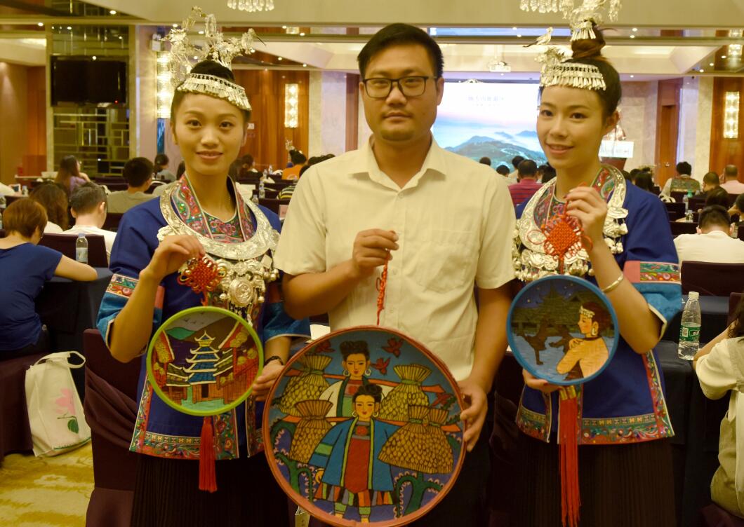 7月19日,在广东佛山市,几名侗族代表在现场展示侗画产品。
