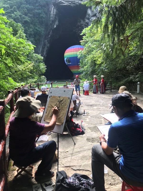 7月27日上午,画家们在导游的带领下来走进中国目前最大的溶洞,世界特级洞穴之一的腾龙洞进行采风。据悉,该洞洞口高74米,宽64米,洞内最高处235米,初步探明洞穴总长度52.8公里,其中水洞伏流16.8公里,洞穴面积200多万平方米。洞中有5座山峰,10个大厅,地下瀑布10余处,洞内终年恒温14一18℃,空气流畅且景色优美迷人,高低错落的树枝和形状各异的岩石,和巨大的洞口,让画家们纷纷拿起手中的画笔在不同的角度描绘腾龙洞,再现场的每位画家对一处景色都有不同的见解和赏析角度,他们通过水墨和油彩等方式绘制腾龙洞的美景。