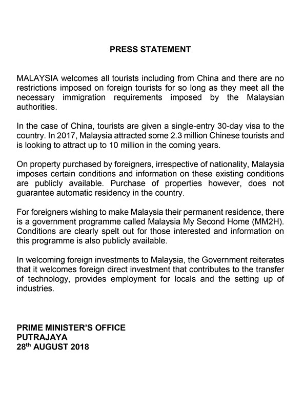 【香港商报网讯】马来西亚总理办公室于8月28日晚发布官方声明表示,马来西亚欢迎包括中国的所有国家的游客,只要他们符合马来西亚官方要求的必要规定,对外国游客没有限制。