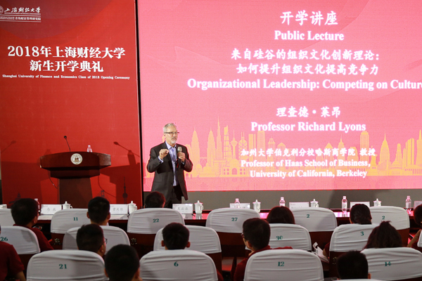 【香港商报网讯】9月8日,2018年上海财经大学青岛财富管理研究院新生开学典礼举行,70名新生及部分校友代表和特邀嘉宾等近200人出席。本次开学典礼中,美国加州大学伯克利分校哈斯商学院教授Richard Lyons从大洋彼岸“空降”现场,为学生们献上了精彩的“开学第一课”——《来自硅谷的组织文化创新理论:如何提升组织文化提高竞争力》主题演讲。