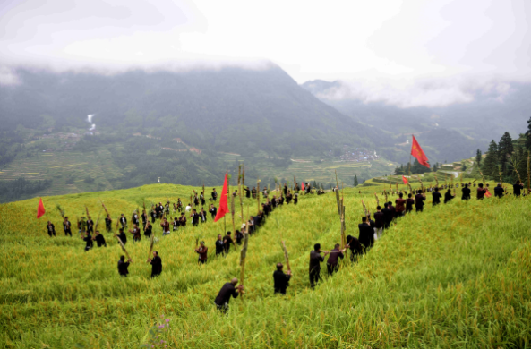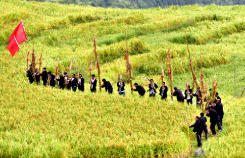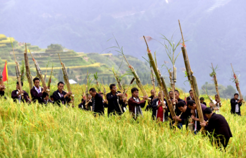 【香港商報網訊】9月23日,首個“中國農民豐收節”,也是貴州省從江縣加榜鄉加車村一年一度的新米節,當地苗族同胞身著節日盛裝,參加慶豐收祈福儀式、吹蘆笙踩堂等活動,載歌載舞迎接“中國農民豐收節”。(吳德軍)