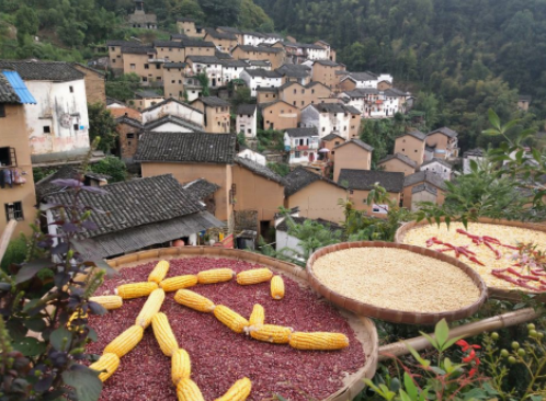 曬秋是皖南典型的農俗現象。秋分時節的的陽產村,農家院場裡、門前屋頂……金燦燦的玉米、黃橙橙的南瓜、圓滾滾的豆子以及板栗、柿子等你方曬罷我登場。曬簟鋪成一幅幅五色斑斕的調色板,顯擺出歸倉前最驕人的風采。