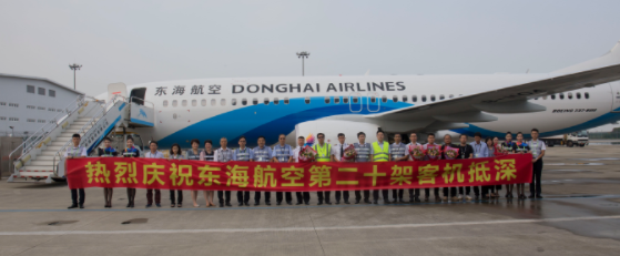 【香港商報訊網訊】記者何松報導:9月27日早晨八點,一架波音737-800在深圳寶安國際機場平穩降落。至此,東海航空機隊規模達到20架。東海航空副總裁陸兵、副總裁陳浩金、副總裁肖兵華、行政人事總監蘆峰及相關部門幹部員工到機坪迎接新飛機到來。