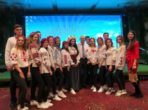 烏克蘭駐華大使奧列格·焦明與黑龍江大學的烏克蘭留學生合影
