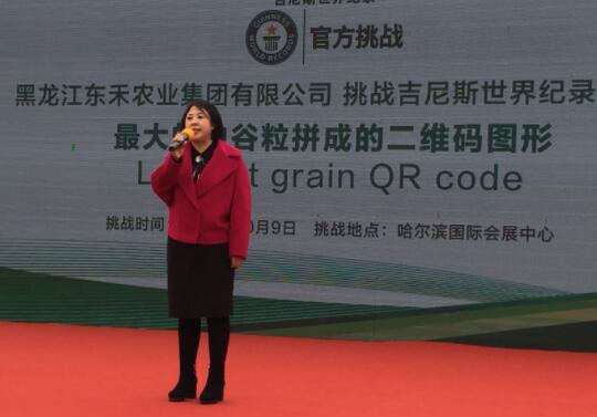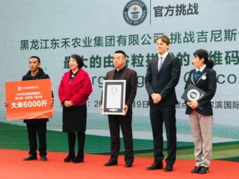 10月10日,東禾集團用黑米和白米擺製二維碼,又將2018中國·黑龍江首屆國際大米節活動推向高潮。該穀物二維碼長寬各30米,由黑白大米各5噸擺製而成,歷時四天擺製而成。在當天上午,成功挑戰吉尼斯世界紀錄,獲得“最大的由谷粒拼成的二維碼圖形”稱號,並舉行了頒證儀式。