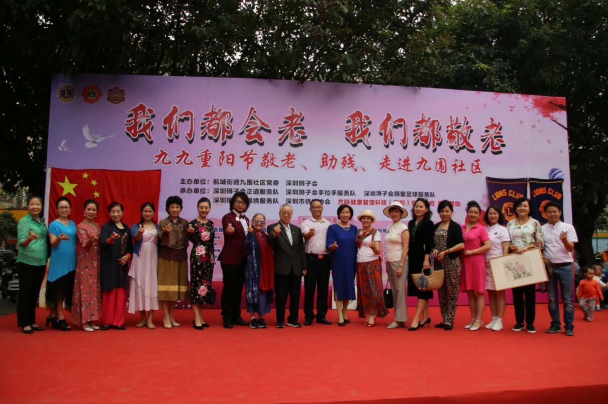 【香港商報網訊】10月13日,由深圳狮子会和深圳宝安区航城街道九围社区党委主办,由深圳狮子会正道服务队、狮爱足球服务队、手拉手服务队、锦绣服务队、深圳市侨媛协会联合承办,各爱心企业和协会联合协办,由方联健康管理科技(深圳)有限公司冠名赞助的九九重阳走进九围社区敬老助残大型关爱慰问活动在宝安区航城街道九围社区广场圆满成功举行。本次活动的主题是“我们都会老,我们都敬老”,这已经是深圳狮子会第三次走进九围社区的敬老助残关爱慰问活动了。本次活动是历届以来规模最大、受益人群最多、服务经费最高、捐助物资最多、参与爱心单位和个人最多、参与服务人员最多的一次,创下了多个之最!现场共计为300位老人和残障人士捐助价值近100000元(全文均为人民币)的常备药品、血压计、保健品、日用品等实用物资;服务经费共计支出74000余元;现场为60岁以上老人和残障人士近400人提供了健康咨询、免费体检以及糖尿病、高血压筛查;现场为残联书画社的残疾人艺术家20余人搭棚设立“爱的典藏”——残疾人书画爱心市集,帮助残疾人艺术家义卖收获善款4000余元;现场共有40余位爱心演员为老人家和残障人士进行了慰问义演。(高凌、方晓蓉、邓相飞、邱红樱)