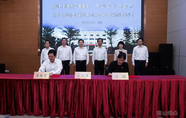 10月11日,南山區人民政府與深汕特別區管委會簽訂了《合作共建南山外國語學校(集團)深汕學校的框架協議》,雙方將在深汕特別區合作共建南山外國語學校(集團)深汕學校,分別建成學前部、小學部、中學部。