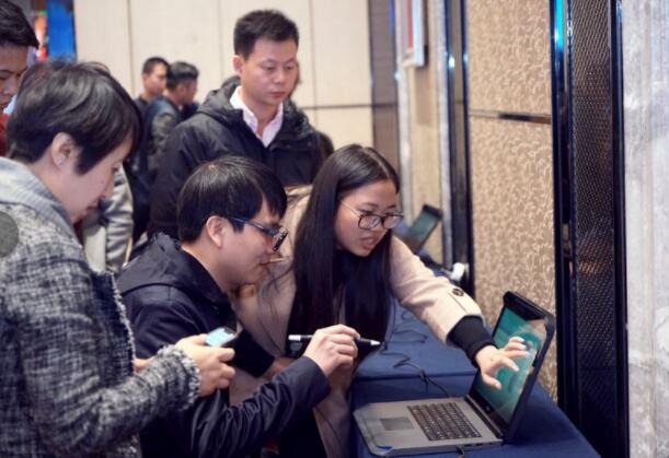 極倍將新款XR筆記本展示在會場兩側,時尚而科技感十足的外觀已經吸引了簽到進場的觀眾簇擁上前體驗,紛紛訝異於其清晰自然的色彩畫面、立體逼真的擴展現實效果及實用豐富的內容資源。