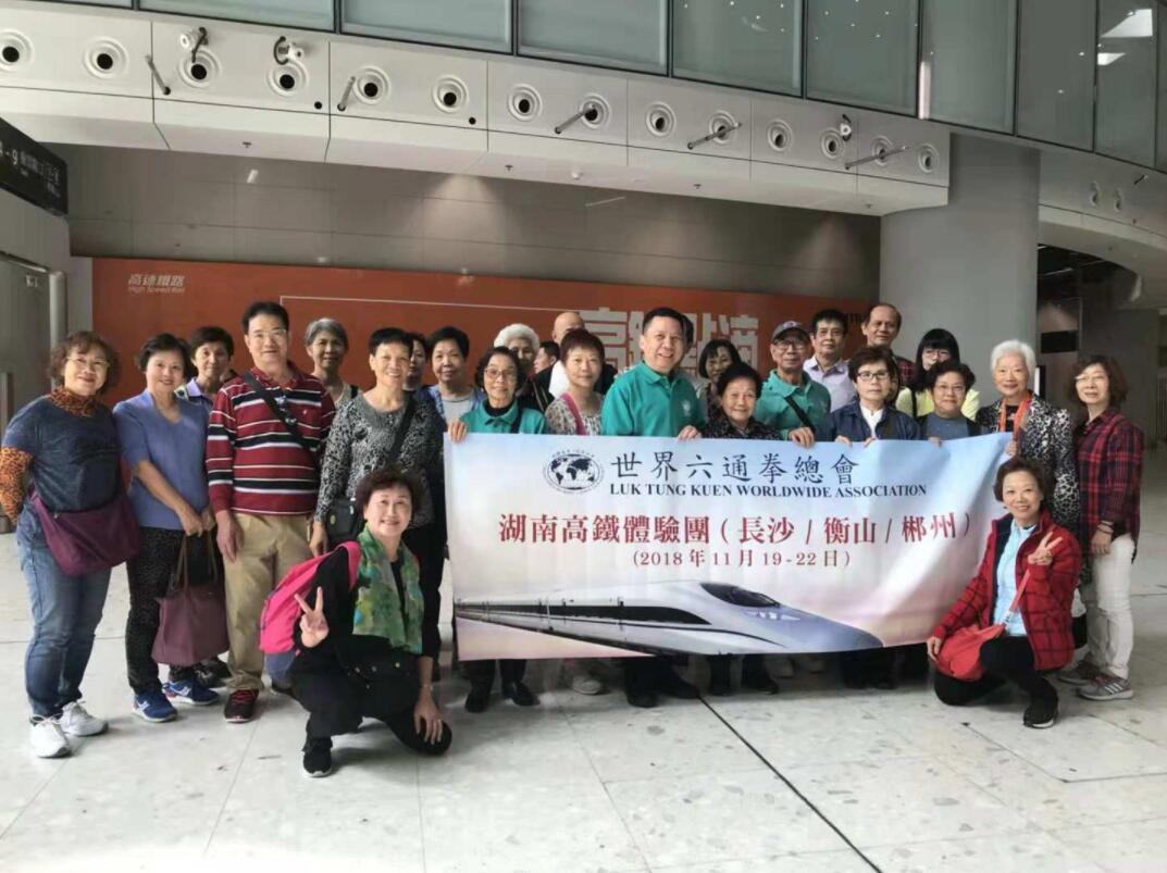 【香港商報網訊】11月19日,世界六通拳總會部分會員在葉常春女士的帶領下,從香港乘高鐵前往長沙,開展為期4天的旅行。世界六通拳會湖南高鐵體驗團拉著橫幅,在九龍高鐵站合影,個個臉上洋溢著愉悅的笑容,非常期待此次湖南旅行。