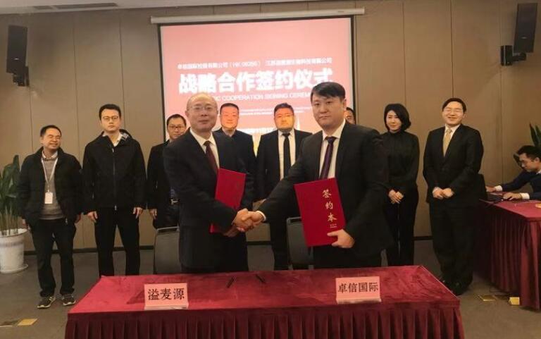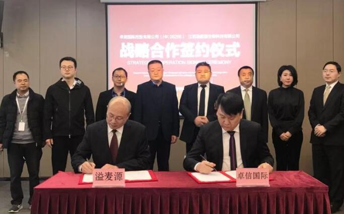 【香港商報網訊】日前,卓信國際控股有限公司(股票代碼:HK 08266)與江蘇溢麥源生物科技有限公司在南通高新技術產業開發區江海智匯園舉行戰略合作簽約儀式。南通高新技術產業開發區相關領導、江蘇溢麥源董事長顧凱強、卓信國際董事會主席馬超、執行董事付勇、總經理陳東全及卓信集團高層領導出席簽約儀式。