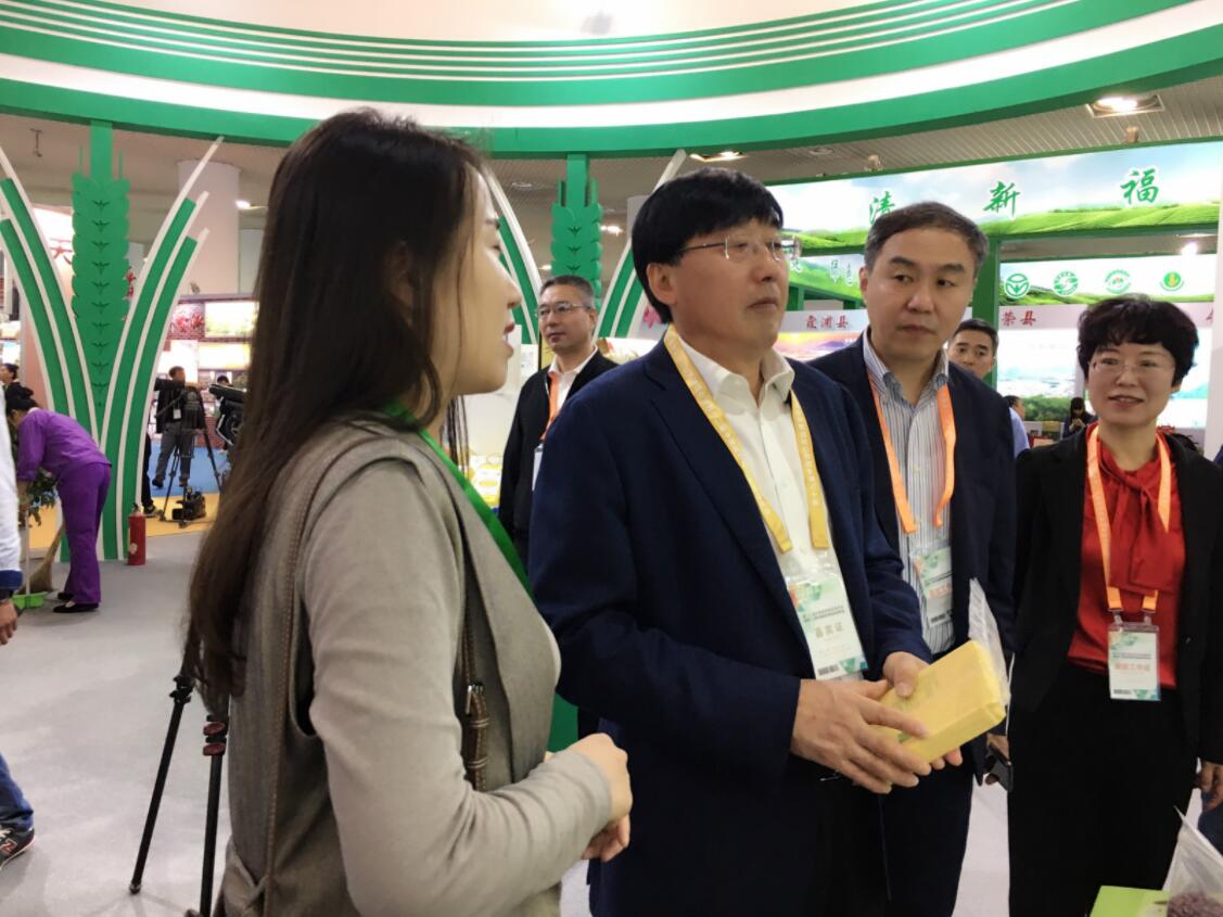 黑龍江省農村農業廳副廳長李世潤、黑龍江綠色食品發展中心主任王蘊琦與雙鴨山參展商交流產品特色