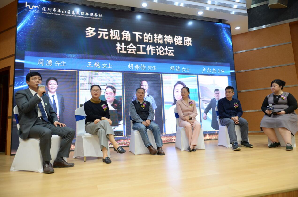 来自来自医务界、心理界、行业协会、香港社工实务界以及社工机构管理领域的的五位嘉宾共同探讨精神健康社会工作的前沿话题。深圳市康宁医院副院长、亚洲家庭研究联盟副主席胡赤怡先生在论坛上做了题为《深圳市精神卫生社工实践与探索》的主旨演讲,阐述了深圳精神卫生社会工作实践的背景、现在及未来;国际积极跨文化心理治疗协会深圳中心负责人邓洁女士也为社工们带来《做丰沛的精神健康社工》,为社工描绘了身体、成就、关系和未来平衡发展的人生画卷。在圆桌论坛环节,胡赤怡院长、邓洁女士以及深圳市社会工作者协会副秘书长兼专业发展部主任王越女士、香港社工协会精神健康社工分会召集人及香港大学社工实习督卢尔杰先生、全国百强社工人物、深圳改革开放三十年口述史口述者、深圳市南山区惠民综合服务社理事长 周湧先生;分别就精神健康社会工作发展、精神健康社会工作伦理、社工专业人才培养、精神健康社工职业倦怠、优秀的精神健康社工成长路径等问题进行了探讨并与台下观众进行了互动。本次论坛为精神健康社会工作者提供了丰富的专业食粮,也给多专业多视角下的精神健康社会工作创造了思想碰撞的有利契机。