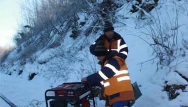 乘坐金河檢養工區的工程車行駛15公里,就是靜嶺道口。線路工們推著發電機在鐵路上向北徒步1.2公里,就是路標“靜嶺300”的鐵路彎道處。兩山夾一溝的南坡,在寒冬裡仍然滲水結冰,巨大的冰牆威脅著列車的安全運行。工人們每隔兩天就要在列車“空窗期”搶時間清除冰雪。