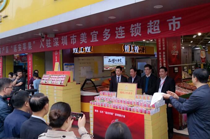 在推介會前,志丹縣委書記李建強,縣委副書記張星,縣委常委、統戰部長王冬梅,縣委常委、副縣長劉建忠,縣人大常委會副主任高仲崗等到深圳美宜多連鎖超市舉行志丹蘋果入駐超市揭牌儀式并參觀了志丹蘋果入駐超市運營情況,并在超市現場為市民免費發放精美禮盒單顆蘋果,宣傳推介志丹“延安蘋果”。