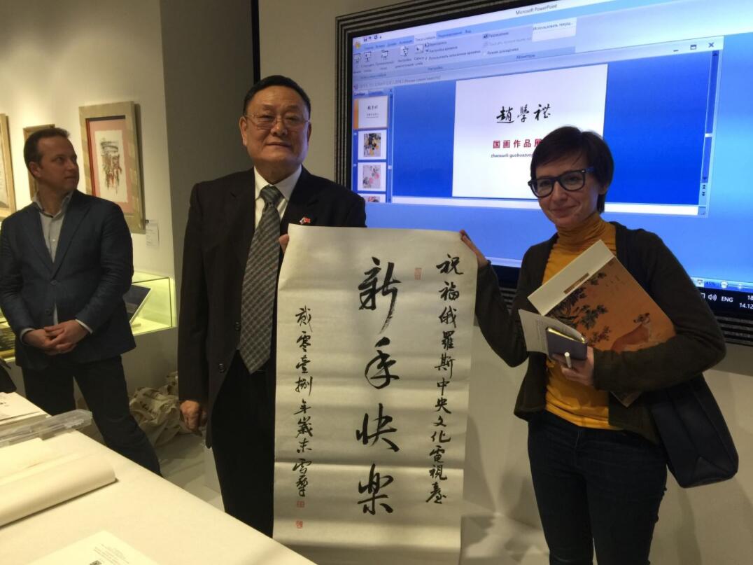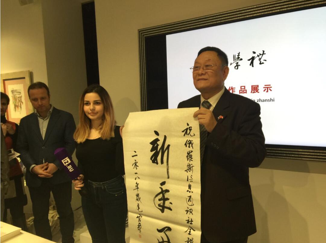 今年5月,趙學禮曾與著名漢學家孔德拉紹娃、美術家科涅霍夫、出版商斯連斯卡婭合作的書法插圖版老子《道德經》一書首發式在莫斯科中國文化中心舉行,俄羅斯民眾對中國書法和老子古典哲學的喜愛程度令人記憶猶新。趙學禮在講話時稱,這次帶來了部分當代中國傑出的書畫家的作品,展現了具有豐富內涵的中華傳統文化,具有濃郁的東方藝術特色。他還稱,自聯合國將中國書法列入世界非物質文化遺產以來,越來越多的國人和外國朋友都對中國書法和中國畫產生濃厚興趣,中國書法和中國畫的簡括而深邃的大寫意精神、詩書畫印的完美融合、形和意、抽象與具象、技與道的充分表達,體現了充滿美感的東方智慧和藝術魅力,如同在中國廣大民眾都特別喜愛俄羅斯的文學作品、音樂、芭蕾舞和油畫一樣,《莫斯科郊外的晚上》在中國民眾中廣為傳唱、耳熟能詳。