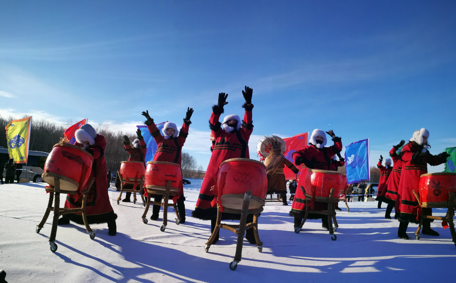 樂舞祭拜是冬捕中必不可少的的活動環節,漁民們用東北四小民族的古老歡快民族舞蹈形式,展現他們對大自然恩賜的敬意。藝術與民俗相碰撞出最為燦爛的火花,九座大鼓分排而立,響動在祭臺周圍,打造“九鼓響天地”的氛圍,魚把頭手持祭湖拜文恭讀,漁民們紛紛舉起裝滿美酒的“東北海碗”,敬天敬地敬五大連池,整個場面氣勢恢宏,是整場“火山冬捕”活動的精彩華章。