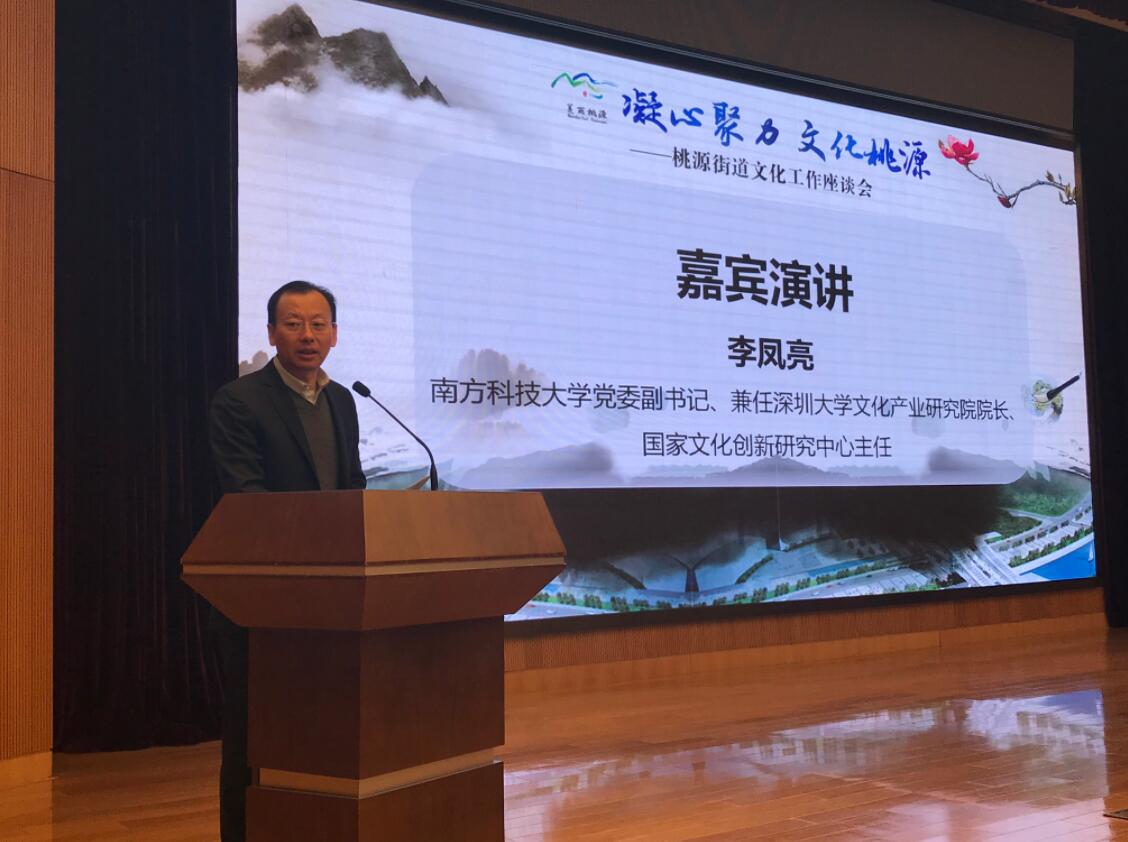 南方科技大学党委副书记、兼任深圳大学文化产业研究院院长、国家文化创新研究中心主任李凤亮先生作主题演讲,演讲题目为《以文化创新助推“三区联动”》。以达了三个观点,第一是桃源具有得天独厚的文化创新优势, 第二个观点是三区融合的核心是文化融合,是互融共处的生态概念,每个社区的发展的模式不一样。其次是,三区融合需要不断的推动路径的创新,发挥各自的主体功能。