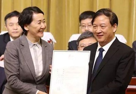 黑龍江省市場監督管理局局長劉小妹(左)把黑龍江北大荒農墾集團總公司營業執照頒發給王守聰。(圖片由黑龍江墾區提供)