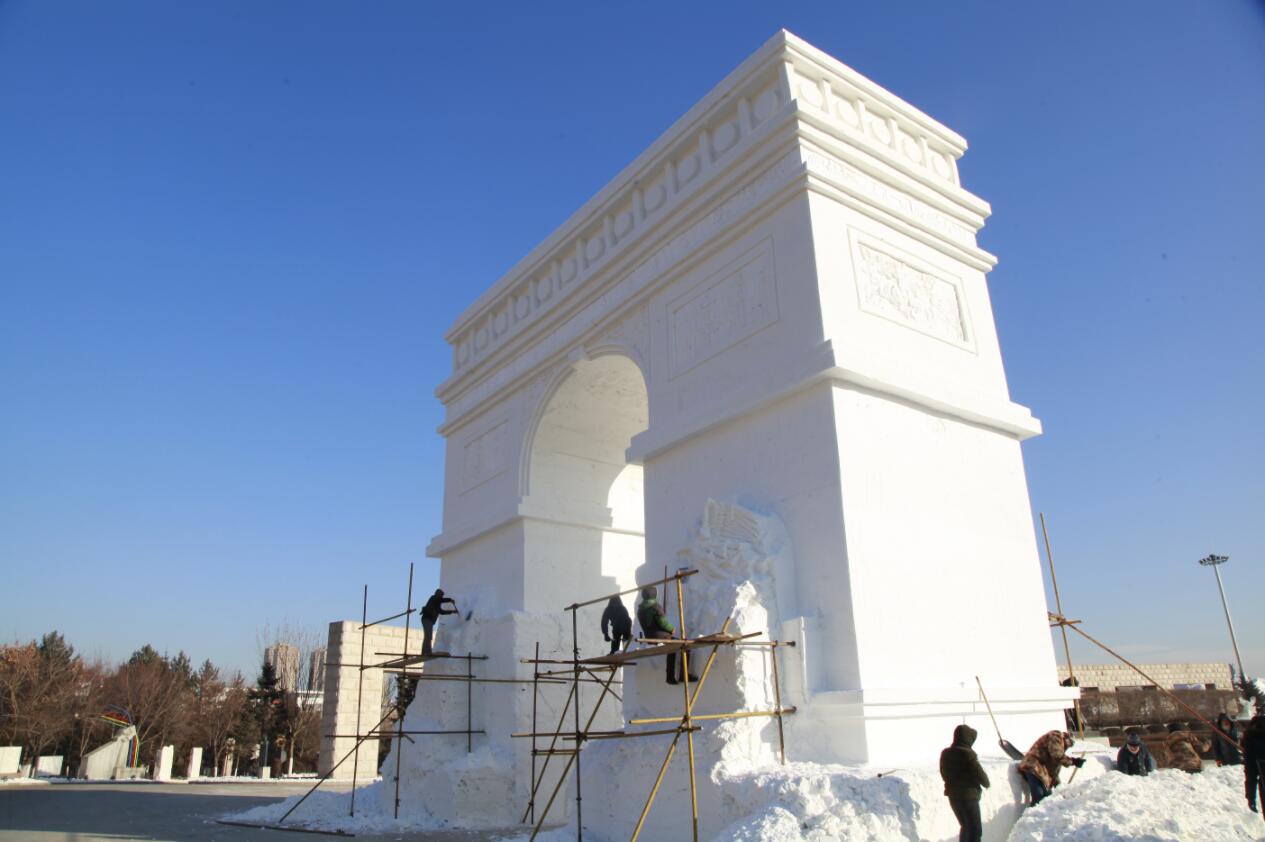 長春世界雕塑公園冰雪天地大型雪雕《凱旋門》正在緊張創作中