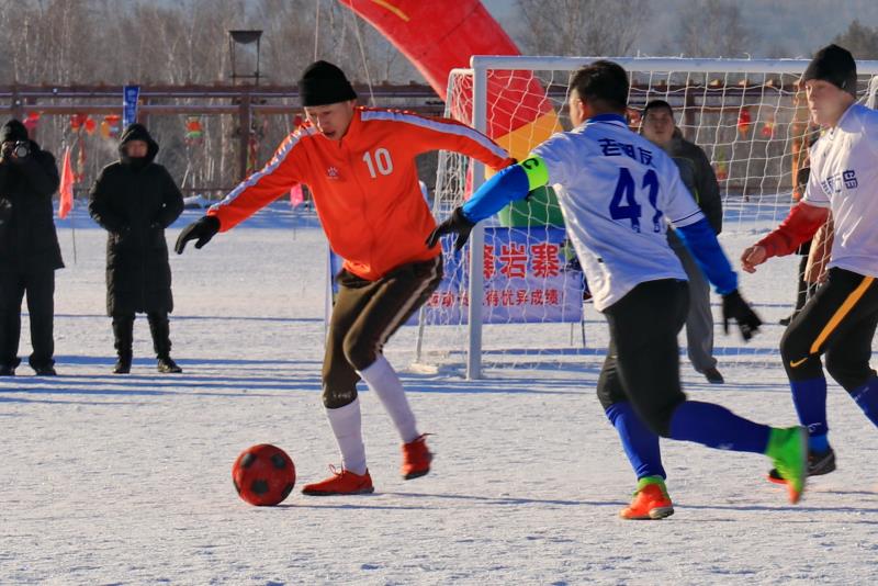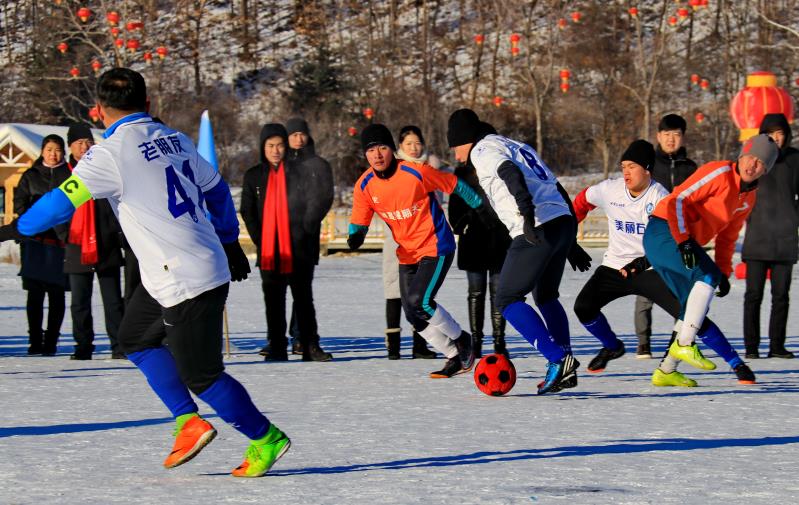 本次比賽賽場設在風景如畫浪漫別緻的景區內。在金山小鎮冰湖雪村,藍天白雲,冰天雪地,潔白素雅,一片北國風光的遼闊景象;皚皚白雪堆砌着金黃色的木屋別墅,大紅燈籠喜慶熱烈;白樺搖曳,雪花簌簌,靜謐怡人。參賽選手們在雪地里健步如飛、穿梭奔跑,傳球、過人、射門!這動靜相宜的場面宛若天地人和的唯美畫卷。