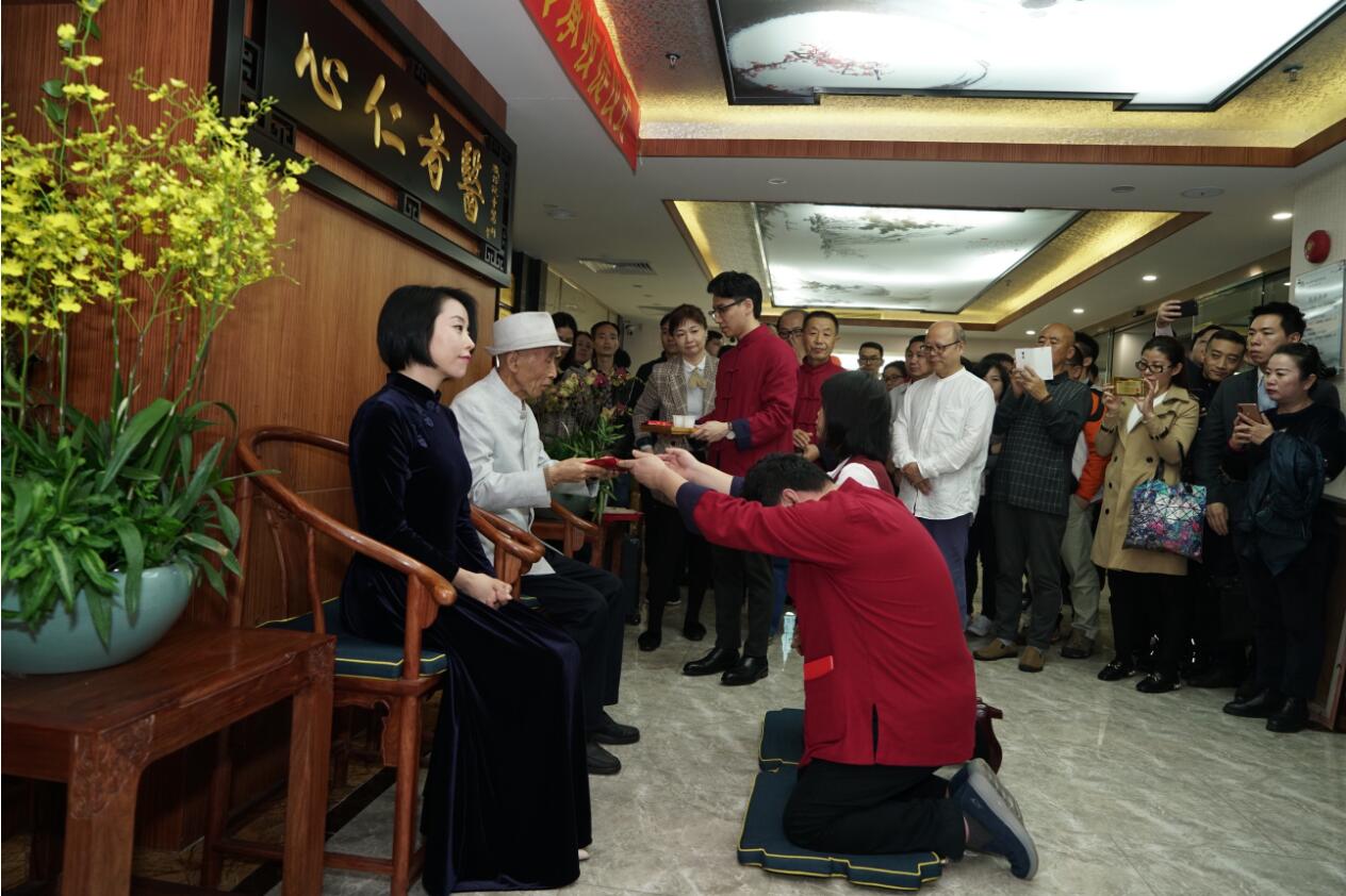 近年来师承这种中医自古以来的传承形式得到国家的重视和大力推动。蒲志孝多年来一直在物色合适学生、希望藉由师承这种模式,亲自执导学生的学习和临诊,培养更多出色的中医临床医生。本次申平堂堂主于洋、乔莉伉俪有幸双双通过老先生的考察,加入蒲氏中医在深圳的首批学生行列。研讨会后,“蒲氏中医传承收徒仪式”在申平堂中医馆大厅举行。两位学生遵循古礼向蒲志孝先生行拜师礼,蒲老先生对他们寄予厚望,希望他们谨遵师训、刻苦学习,为中医传承尽心尽力。
