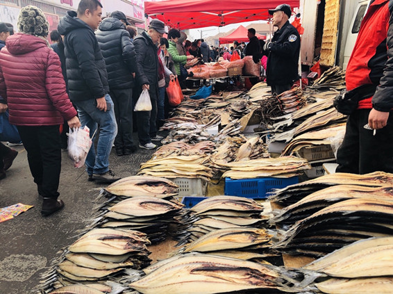 據介紹,王哥庄大集在1873年就是附近有名的集市,逢農曆四、九為集市之期,最熱鬧時候是臘月十四、十九、二十三小年集。大集以王哥庄利客來門前活動廣場為中心,分為七部分,海鮮產品、王哥庄大饅頭、海水豆腐、嶗山茶、嶗山剪紙、石花菜等各個品種應有盡有。其中,最大的亮點就是乾鮮海產品,甜曬鮁魚、乾麵包魚、干墨魚、干鰻鱗魚、干鼓眼魚等200餘種王哥庄當地正宗干海產品,甜曬魚還在2018年春節登上了《舌尖上的中國3》。