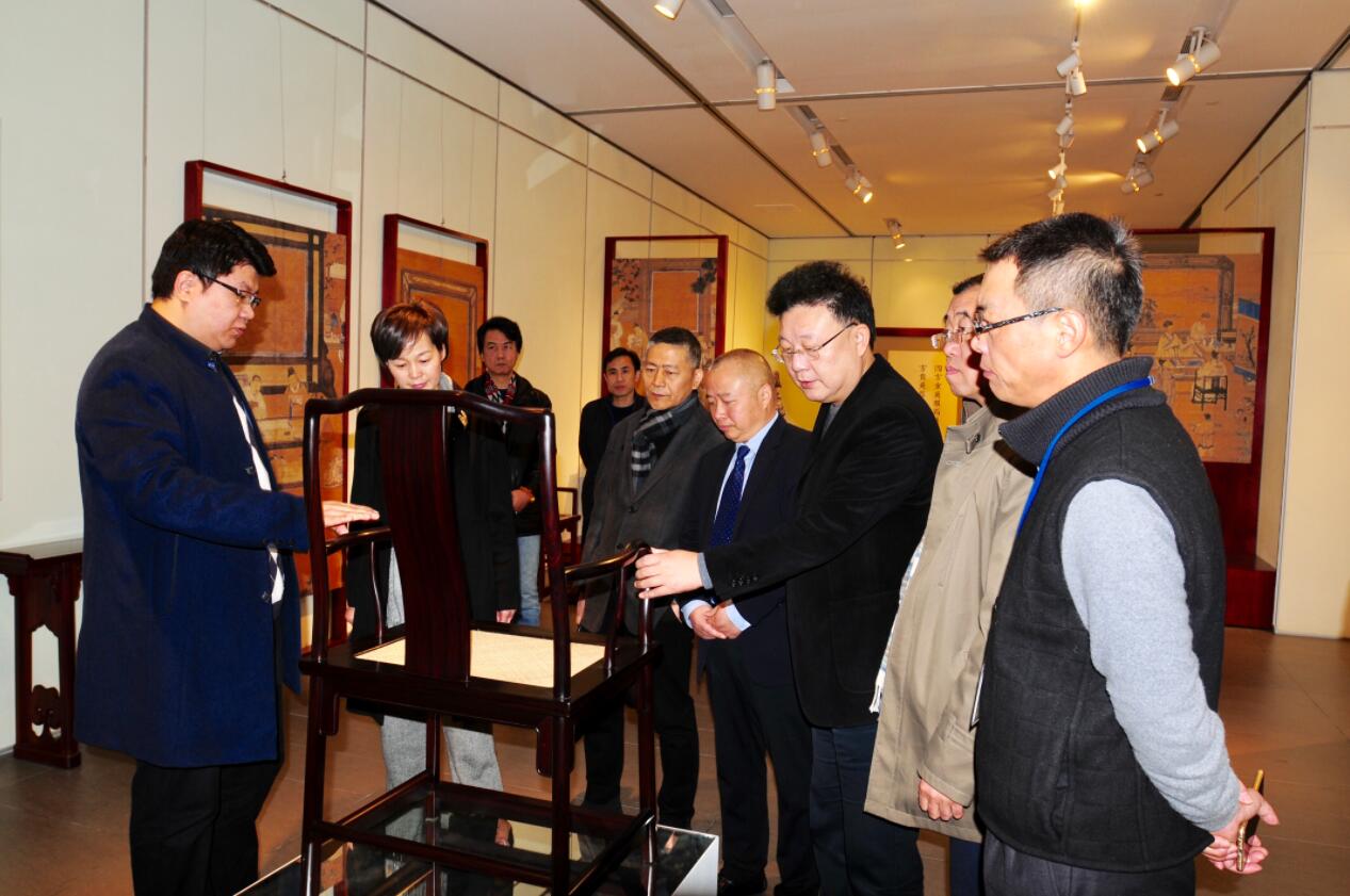 在巡展現場,首入眼帘的明代仇英版《清明上河圖》,這件作品讓大家看到了蘇州府的繁華。在「材料工坊」展區內,從硬木到紅木的介紹,蘇作紅木主要材料、輔料的圖文展示,並配以部分材料實物展示,讓觀眾領略到什麼是材美料堅。「工藝長廊」展區中的南官帽椅以及拆解圖、題字背板拓片等,折射出「四方重吳服而吳益工於服,四方貴吳器而吳益工於器」的工匠精神。夾頭榫、插肩榫、格角榫、燕尾榫……「內外兼修」的發明創造鑄就了器物結構的「萬年牢」,還能達到視覺美觀的效果。一件件榫卯構造模型也滿足了大家指尖上的體驗,過了一把拆拼傢具「關節」的癮。「蝶幾廳」中展示了明代杜堇《十八學士圖屏》中的蘇作傢具,其中「蝶幾」桌又名「七巧桌」,由明代蘇州常熟人戈汕發明,它的出現對組合傢具的發展產生了深遠影響,「蝶幾」桌一度失傳,近年由常熟市東方紅木傢俱藝術館根據史料將其還原製作。「傢具長廊」展區中展示的一款款新中式傢具時尚而實用,簡約而大氣,符合現代審美,更詮釋着「制器尚用」的真諦。傳統榫卯結構能有效限制傢具變形,還可以合理地傳送、分散、化解應力,大大延長傢具的使用壽命。「線條的藝術」與傳統書法有異曲同工之妙,不事雕飾就能展現木材的天然紋理之美,還充分運用了人體工程學原理,融入時尚元素,讓這些紅木傢具充滿了現代氣息,給人們帶來了強烈的視覺震撼。