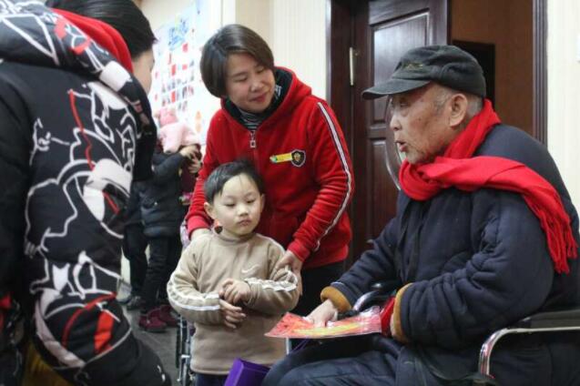歌舞表演結束後,在老師、家長們的幫助下,幼兒們把帶來的紅色圍巾、新年福字、手工作品、新年點心一一送到每位老人的手中。有些幼兒還親手把圍巾給老人們圍上。一位老奶奶接過新年禮物後淚光盈盈激動地說:“今天看到你們,就像看到我的親孫子、親孫女一樣。你們真孝順呀!”別嘉溪小朋友的媽媽陪著孩子一起來到老年公寓慰問老人,他們把精心準備的新年禮物親手送給了一位90多歲的紅軍老爺爺,老爺爺高興地說:“你們這麼小就知道尊老愛老,我真高興!你們都是國家的美好未來啊!”