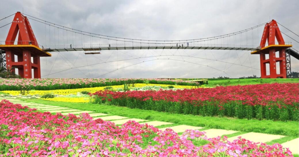據蜀南花海景區相關負責人介紹,春節期間,景區推出了高空玻璃觀景橋、旱雪滑草、萌寵樂園等系列新產品。值得一提的是,高空玻璃觀景橋是全國首座集觀光平臺,橋身一體的空中廊橋。長度200米,高度39米,集觀光、體驗、娛樂為一體的大型高空觀光項目。