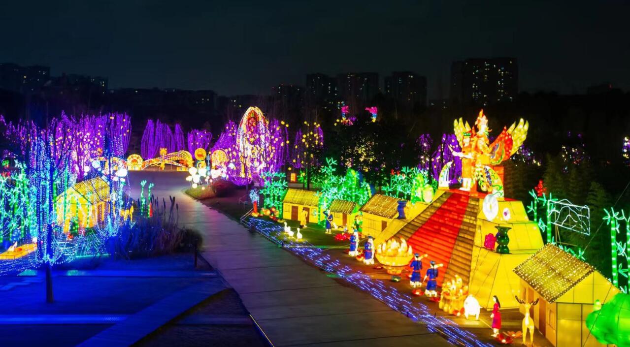 神秘的北緯30度孕育了兩個古老的文明——古蜀和瑪雅。雖跨越千里,兩個文明卻有著驚人的相似,他們都崇拜太陽,敬畏天地神靈,在不同的土地上勾勒出萬物有靈的世界。據瞭解,兩個文明的對話是本屆燈組的一大亮點。太陽神鳥雕塑沙地佇立的“太陽之光”燈組,是本屆最絢麗的大型燈組之一,展示了瑪雅人與古蜀人相似的宇宙觀。沙地中心屹立的太陽神鳥雕塑在燈光下熠熠生輝,代表著古蜀人民的信仰;七個大小不一的太陽曆環繞雕塑四周,展示瑪雅文明中不同曆法的表達,共同彙聚成宏大的“太陽之光”。