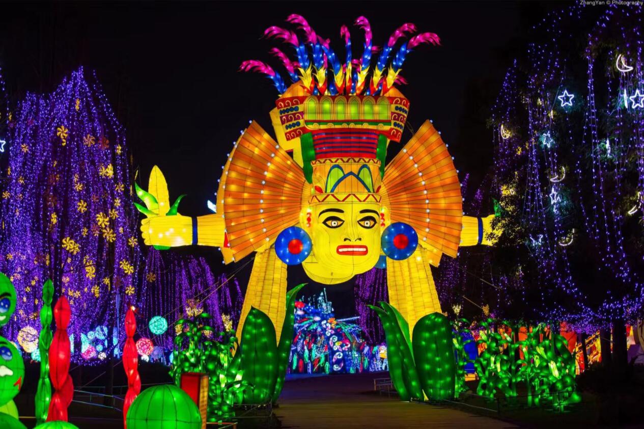 而“瑪雅之光”燈組則是世界上首次運用彩燈的手法,再現神秘的瑪雅世界,引領遊人穿越時空,欣賞這一古老文明留贈現世之美。15米高的“玉米神門”形象生動地再現瑪雅人最崇拜的神靈,茂盛的玉米景觀再現農業豐收的景象。超12米高的“瑪雅神廟”也高聳屹立,肅穆莊嚴,明亮的色彩在夜晚格外奪目,似乎能追尋到瑪雅人在此舉行宗教儀式的身影。