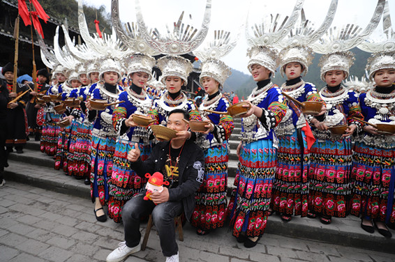 遊客在苗寨體驗敬酒方式「高山流水」的情景