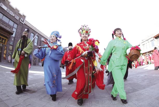廟會期間,大盛魁文創園南區北廣場的主舞臺、大召東倉及西城門樓子將分別開展社區烏蘭牧騎專場演出、非遺傳統民俗項目和蒙古族婚禮表演等活動。“遊八仙”活動當日,來自民間文藝團體的300餘人在大盛魁文創園廣場上扭起了歡快的秧歌。