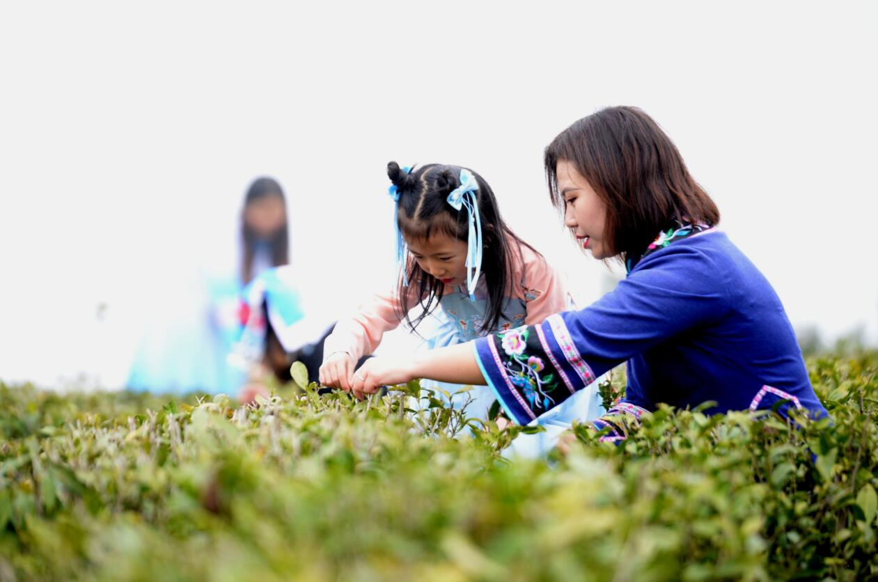 母女兩個正在採摘茶葉