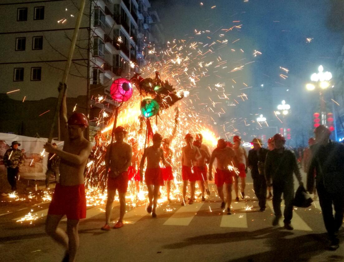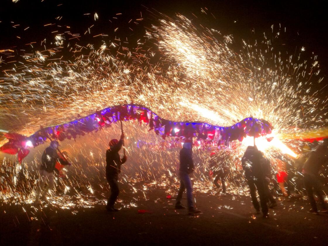 當晚,縣城鑼各村寨的舞龍雲集縣城,人們會用自製或買來的噓花筒對龍噓花,一時間鑼聲、鼓聲、炮竹聲喧聲貫耳。