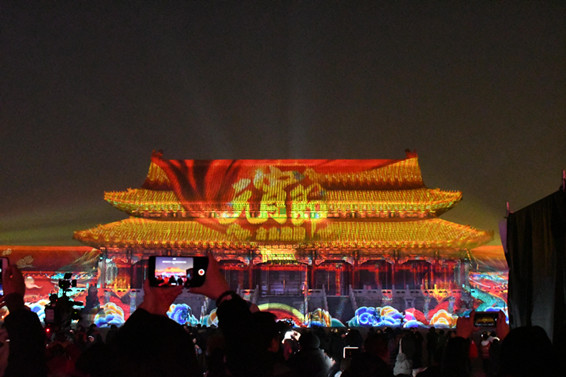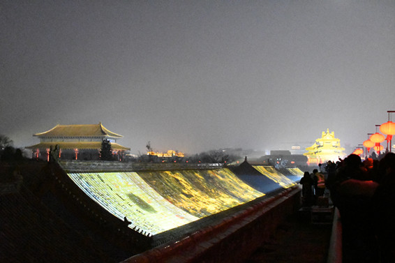 故宮午門的燈光秀氣勢恢宏,彰顯故宮的皇家氣派;太和殿在江崖海水紋和祥雲紋飾的裝點下呈現出碧海雲天的莊嚴景象,「上元之夜、元宵節、保國利民、賀歲迎祥」等變換的字樣投射在殿頂之上,贏來遊客一片片的驚喜和讚歎聲。