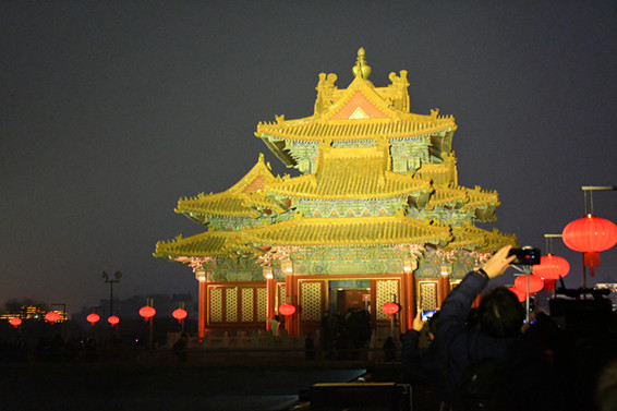 是夜,從午門—雁翅樓、東南角樓到東華門、東北角樓、神武門,故宮古建展示區通過泛光照明被全部點亮。