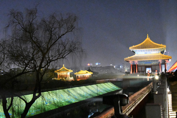 而就在城牆內側建築的屋頂上,「清明上河圖」大型燈光秀首先映入遊客的眼帘,伴着潺潺流水聲,引得無數遊人駐足。