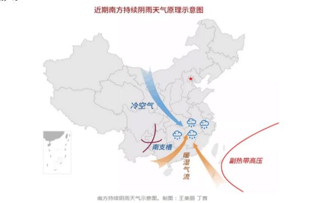 從今年冬季情況來看,一是青藏高原南側不斷生成的南支槽異常活躍,引導來自孟加拉灣和印度洋的水汽源源不斷向東輸送;二是受厄爾尼諾狀態影響,西太平洋副熱帶高壓異常偏強、偏西的狀態持續穩定,使得西太副高外圍的來自南海的水汽,外加南支槽引導過來的大量水汽遭西太平洋副熱帶高壓的圍堵,無處可去,不斷輸送至我國南方;三是入冬以來冷空氣活動多且勢力偏強,冷暖空氣頻繁交匯在長江中下游地區,導致我省2018年12月1日~2019年2月23日出現歷史罕見的持續陰雨寡照天氣。