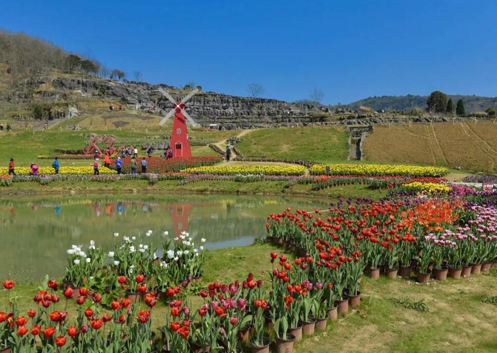其中,西遞石林景區有着鬼斧神工般的石林喀斯特地貌,鬱金香花海世界,徽州第一滑道,皖南最長彩虹旱地滑草場……周邊依山就勢種植了32畝花卉,不僅有5萬株香水百合,還有向日葵、硫磺菊等十餘種花卉品種。一年四季讓遊客置身「花海」。當前石林百畝鬱金香已經陸續開放,三月初即可進入盛花期。