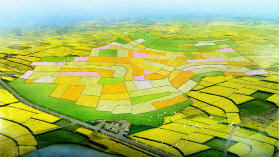 漢中市漢台區毛堰觀花點設彩色油菜花海色帶和大地藝術文字景觀
