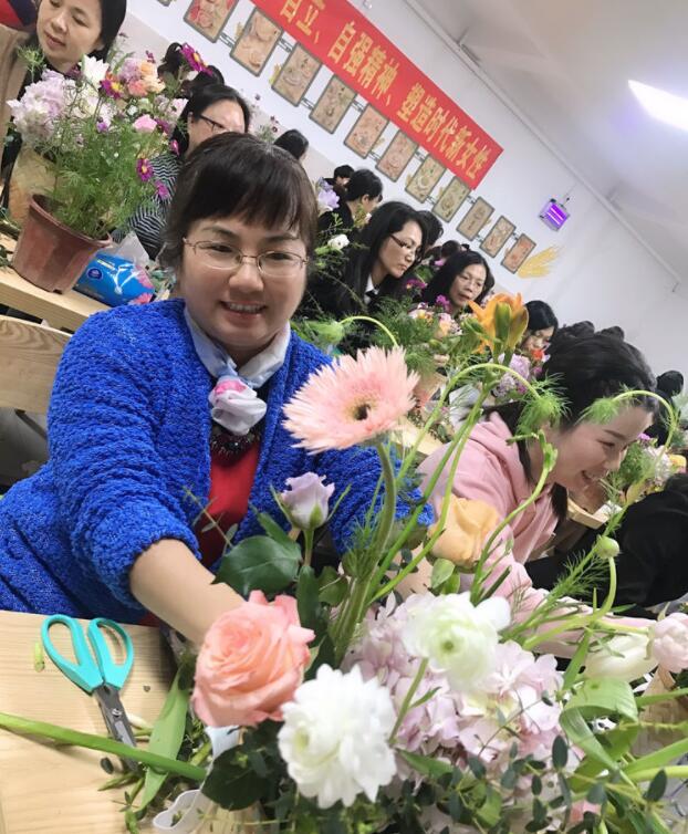 活動現場,花藝老師邊講解家居花卉知識邊演示指導參與活動的婦女們製作自己喜愛的花藝作品。從鮮花的常識、鮮花的選擇與購買,到鮮花的保養與擺放,再到插花藝術的講解、家居花藝布置,花藝師帶領大家在悠然的花香浸染間享受閑適與自然。