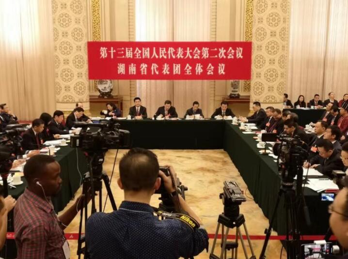 【香港商報網訊】記者 李銀明 報導:7日下午,十三屆全國人大二次會議湖南代表團第四次全體會議向媒體開放,吸引了多家中外媒體記者前來采訪。