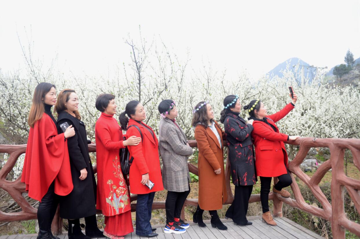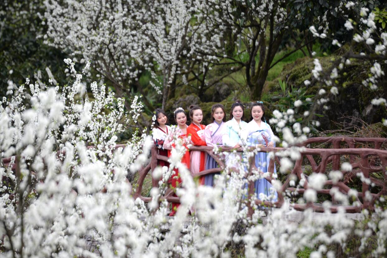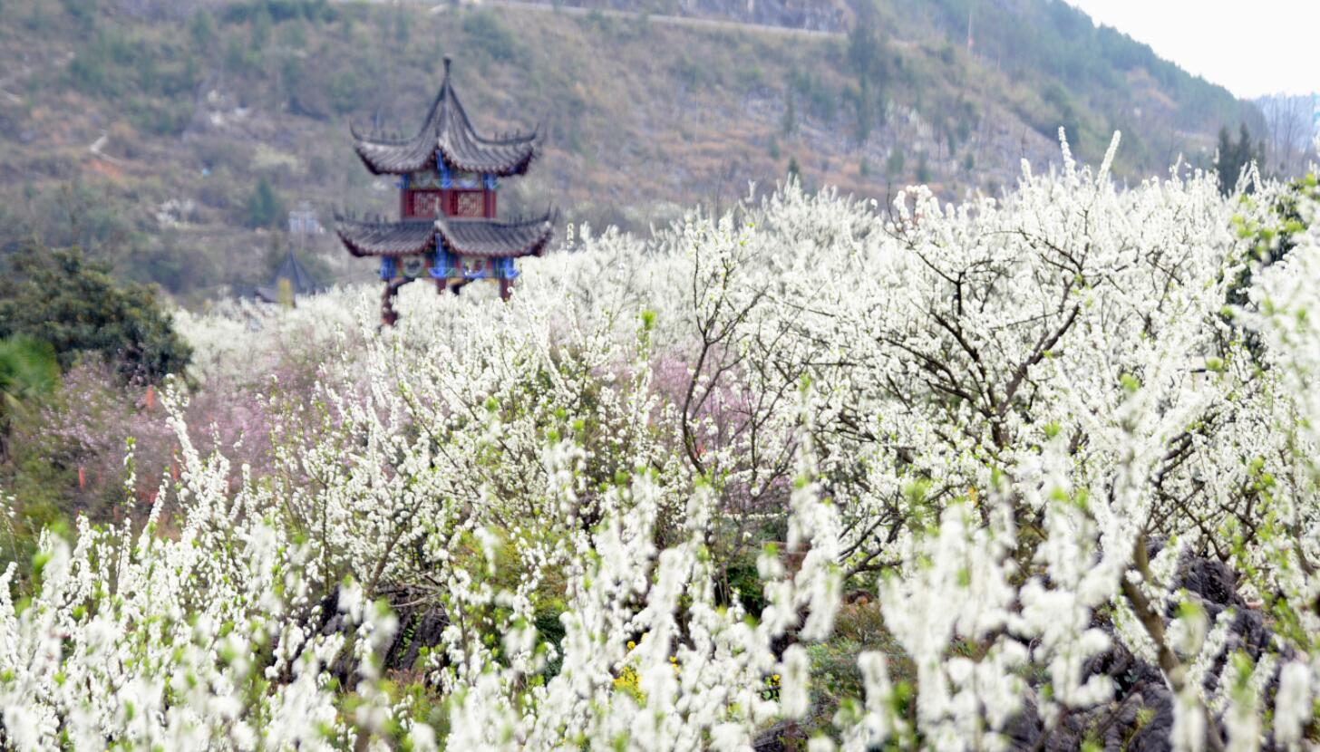 【香港商報網訊】記者 黃慶松 報導:19日,在貴州銅仁市沿河土家族自治縣沙子街道,幾萬畝空心李花綻放,吸引不少遊客到紛至前往賞春尋花,拍照留念。