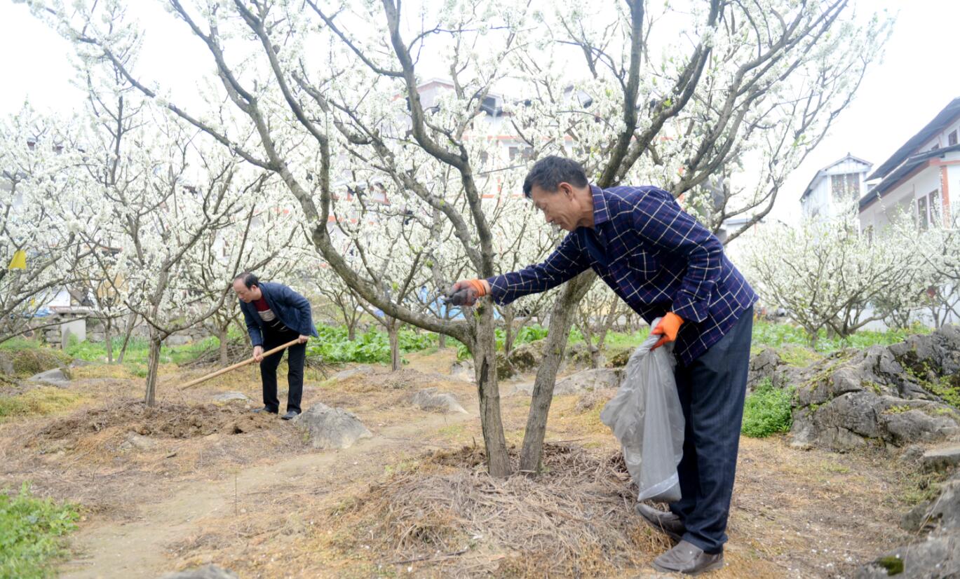 當天記者在現場看到,這裏「漫天花海」,只見潔白素雅的李花綴滿枝間,微風輕拂,片片花瓣隨風飄零,散發出淡淡的清香,辛勤勞作的村民們給李子樹施肥,一片人勤春早的美麗景象。
