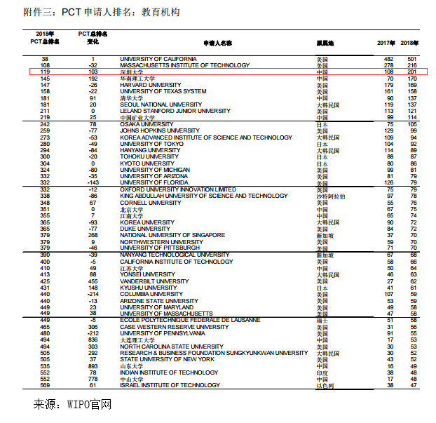 2018年全球PCT專利申請量超過了創紀錄的25萬(253,000)節點,比2017年增長3.9%。在高校專利申請數量排名方面,2018年加利福尼亞大學以501件排名第一,美國麻省理工學院以216件排名第二。緊隨其後的是深圳大學(201件)、華南理工大學(170件)和哈佛大學(169件)。上榜的前十所高校中,有五所來自美國,四所來自中國,一所來自韓國。中國高校在2018年首次晉級前十。