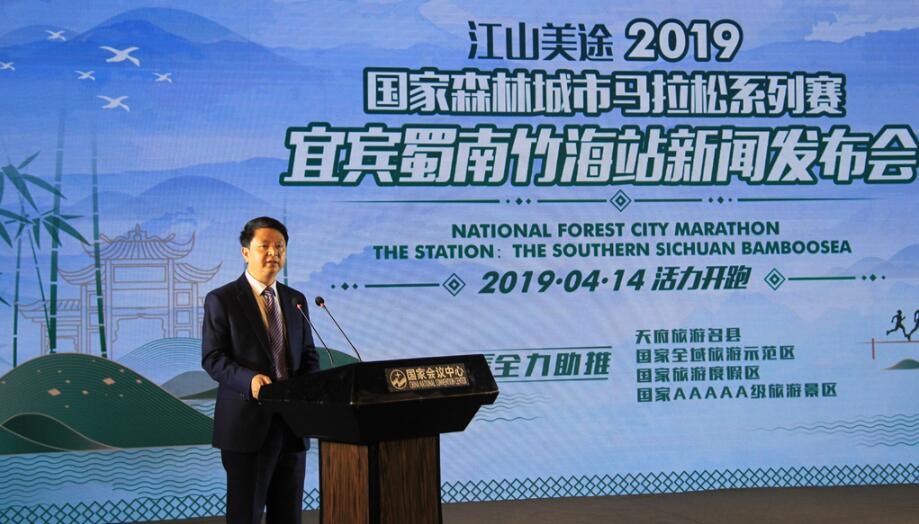【香港商報網訊】3月18日,四川省宜賓市長寧縣在北京國家會議中心召開的新聞發佈會上,發佈江山美途2019國家森林城市馬拉松賽——宜賓蜀南竹海站4月14日將在宜賓市長寧縣開跑的信息。