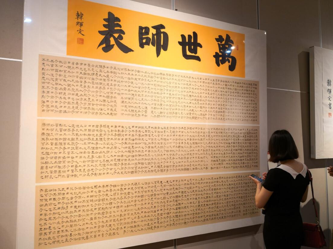 據瞭解,為籌備此次展覽,韓輝定籌備了四年,多次閉關書寫,愛寫字、「癡」寫字的韓輝定擁有不少「大」作品:50條屏、共5千餘字的《道德經》;20條屏、1萬6千餘字的隸書作品《論語》等等。23日展出的近百幅作品講述著過去近20年裏,韓輝定在紙墨筆硯之間的習字之路。